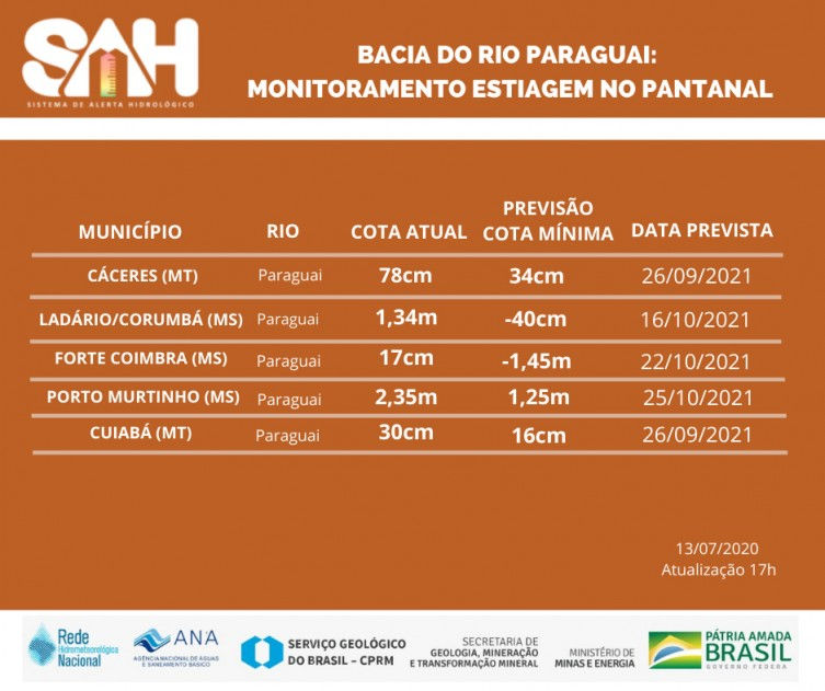 Nas estações de Bela Vista do Norte (Cáceres), Porto São Francisco (Corumbá), Ladário, Forte Coimbra (Corumbá) e Porto Murtinho, o nível do rio permanece na zona de atenção para mínimas, que compreende a faixa de valores de nível d’água situados entre os 10% menores registros de nível e os valores mínimos ocorridos em cada série histórica das estações (para este período do ano). Comparando com o histórico de monitoramento na região, a vazante que ocorre no ano 2021, tal qual a de 2020, aproxima-se significativamente das vazantes observadas no período compreendido entre os anos de 1967 e 1973.
